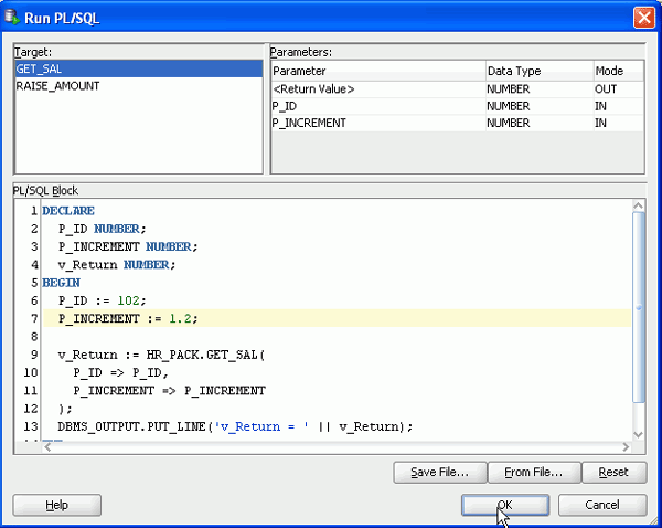 P_IDに102を、P_INCREMENTに1.2を設定します。 これは、102というIDを持つ従業員の給与が20%上昇したことを意味します。 EMPLOYEE_ID 102の現行給与は17000です。「OK」をクリックします。