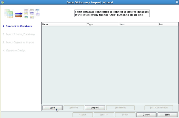 データ・ディクショナリのインポート・ウィザードが開きます。 データベースへの接続を作成するには、「Add」をクリックします。