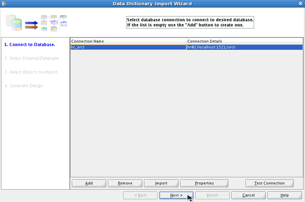 データ・ディクショナリのインポート・ウィザードで先ほど作成した「hr_orcl」接続を選択し、「Next」をクリックします。