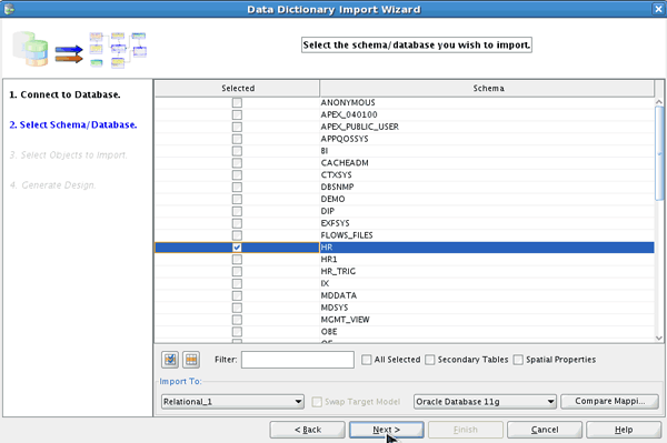 ここではHRスキーマのみをインポートするため、 「HR」スキーマを選択し、「Next」をクリックします。