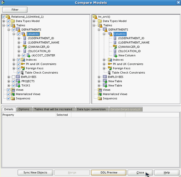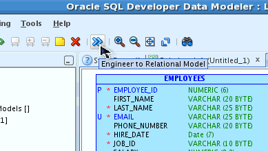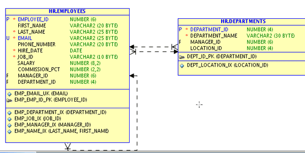 - 2つの表(EMPLOYEESおよびDEPARTMENTS)をHRスキーマからSQL Developer Data Modelerにインポートします。