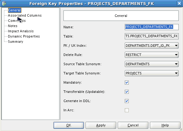 Foreign Key Propertiesダイアログが開きます。 左側のナビゲータで、「Associated Columns」を選択します。
