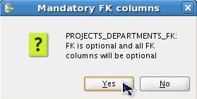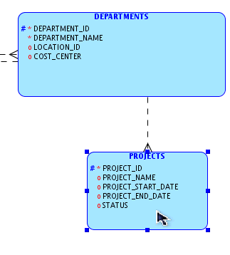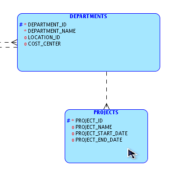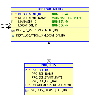 」矢印を選択します。 FKリレーションが作成されます。 PROJECTS表のDEPARTMENTS_DEPARTMENT_ID列に付加された'F'によって、この列が外部キーであることが識別できます。