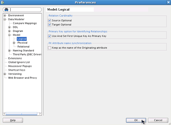 「Data Modeler」→Model」と展開し、「Logical」を選択します。 「Keep as the name of the Originating attribute」チェック・ボックスの選択を解除します。