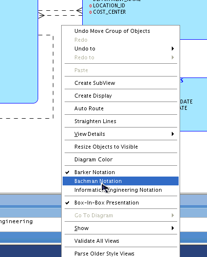 表記法をBachmanに変更します。 ダイアグラムの空白部分を右クリックしてコンテキスト・ウィンドウを表示します。 「Bachman Notation」を選択します。