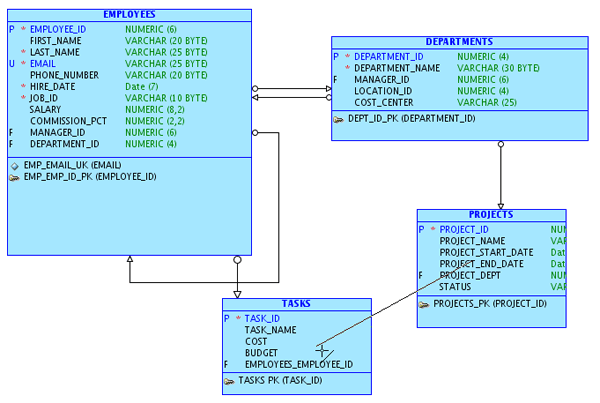 新しいSTATUS列、PROJECT_DEPTという名前に変更された外部キー、および新しいTASKS表を確認します。