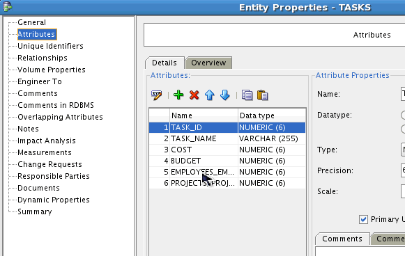 NameにTASK_IDと入力し、Datatypeに「Logical」を、Typeに「NUMERIC」を選択します。また、Precisionに6と入力し、「Primary UID」チェック・ボックスを選択します。 次に、「+」add attributeアイコンを選択して、別の属性を追加します。