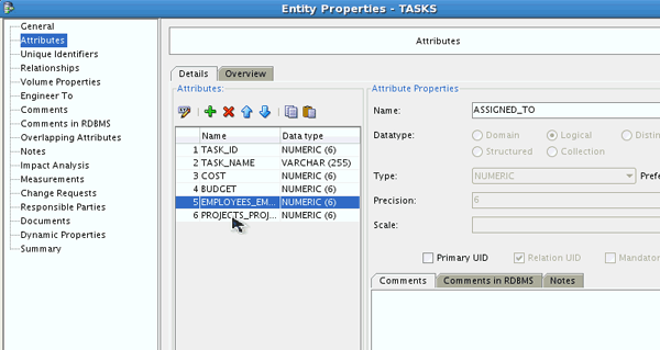 Engineer to Relational Modelウィンドウが表示されます。 「Entities」→「PROJECTS」→「Attributes」と展開します。 両者の違いを確認します。 「Engineer」をクリックします。