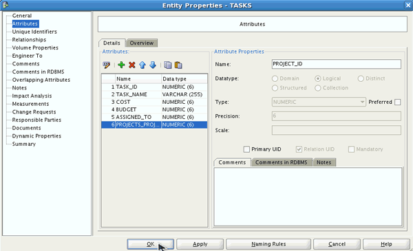 NameにBUDGETと入力し、Datatypeに「Logical」を、Typeに「NUMERIC」を選択します。また、Sizeに6と入力し、「OK」をクリックしてエンティティとその属性を作成します。