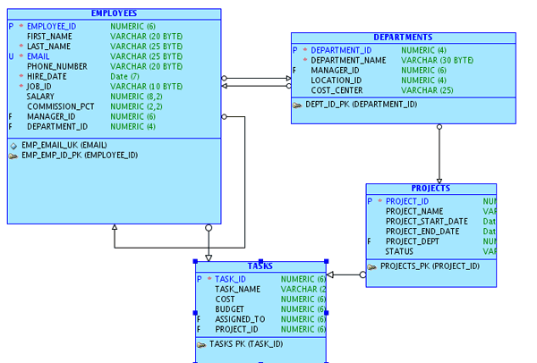 - 新しい表(PROJECTS)を追加してDEPARTMENTS表に結合し、EMPLOYEES表に新しい列(MOBILE_NUMBER)を作成します。