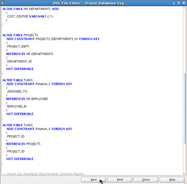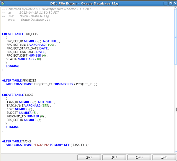 生成されたコードが表示されます。 CREATE文とALTER文を確認します。 PROJECTS表とTASKS表が作成され、主キーを作成するように変更されています。 ページの下までスクロールします。