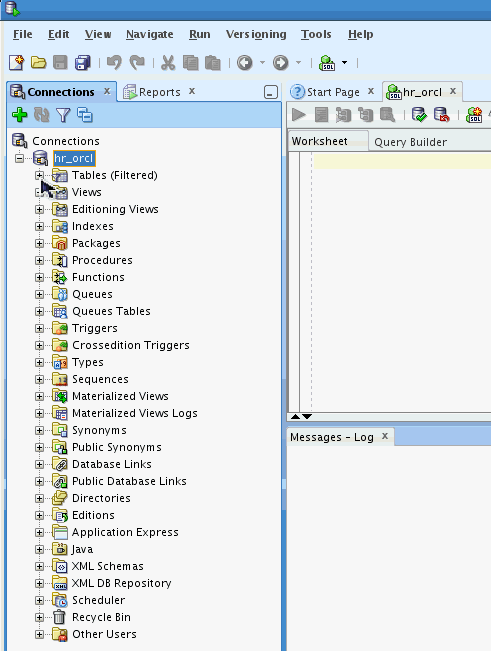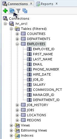 「hr_orcl」接続を展開し、 すべてのオブジェクト・タイプを確認します。 「Tables」を展開します。 次の項では、hrスキーマに現在含まれているオブジェクトを確認します。
