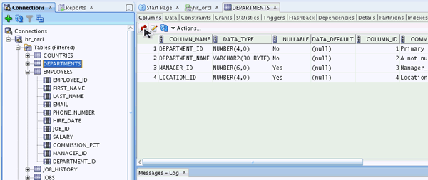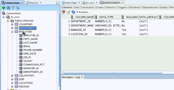 Oracle SQL Developer Data Modelerで前のチュートリアルを実行済みの場合、リレーショナル・モデルのDEPARTMENTS表に追加したCOST_CENTER列が現時点では存在していないことに注意してください。 今のところ、PROJECTS表とTASKS表もスキーマに含まれていません。 hrスキーマを変更するためのスクリプトは次のトピックで実行します。