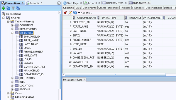 「EMPLOYEES」表を展開します。 列の定義が一覧表示されています。