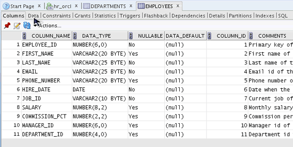 このトピックでは、hrスキーマ内の既存のオブジェクトを確認します。