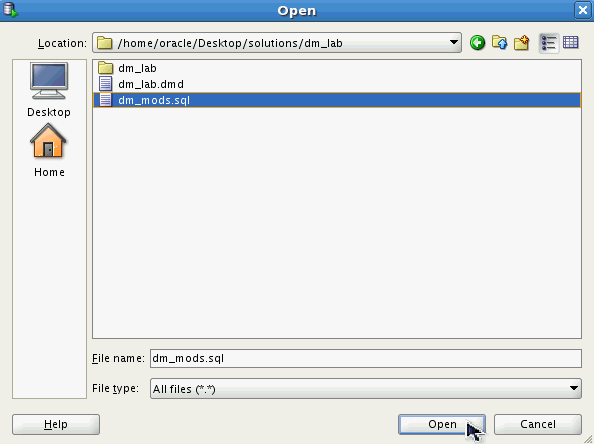 「Desktop」アイコンを選択して前のチュートリアルで作成したファイルを選択するか、または/home/oracle/Desktop/solutions/dm_labディレクトリへ移動して「dm_mods.sql」ファイルを選択し、「Open」をクリックします。