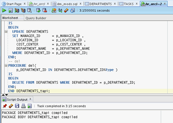 DEPARTMENTS表に対するAPIパッケージを作成するためのPL/SQLコードが表示されます。 コードを確認します。 挿入(ins)プロシージャ、削除プロシージャ、更新プロシージャが含まれています。 「Run Script」アイコンをクリックしてパッケージを作成します。