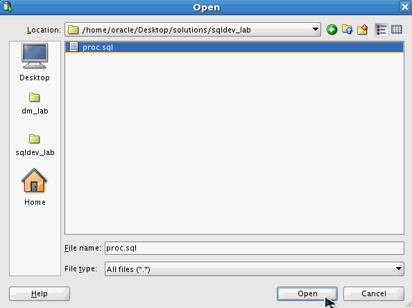 /home/oracle/Desktop/solutions/sqldev_labディレクトリへ移動し、「proc.sql」ファイルを選択して「Open」をクリックします。