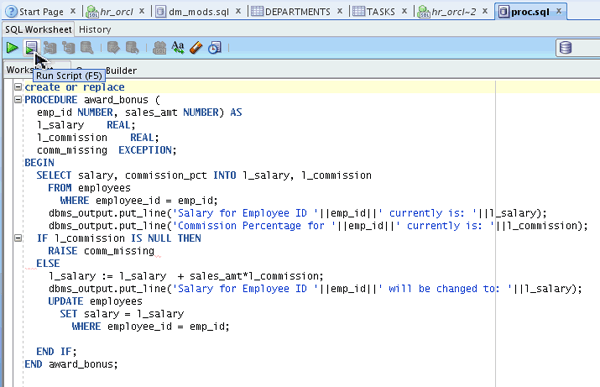 「Run Script」アイコンをクリックしてAWARD_BONUSプロシージャを作成します。