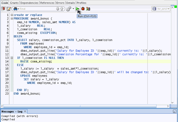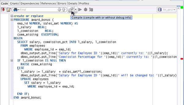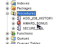 プロシージャのリストから「AWARD_BONUS」を選択します。 警告アイコンは、プロシージャのコンパイルが正常に完了していないことを示しています。