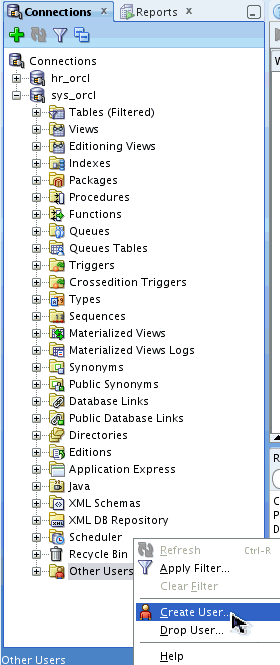 接続が正常に作成されました。 「hr_orcl」接続を縮小します。 「sys_orcl」接続を展開し、「Other Users」を右クリックして「Create User」を選択します。