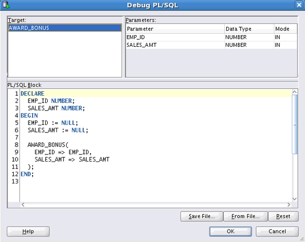 Debug PL/SQLダイアログ・ウィンドウが表示されます。 EMP_IDとSALES_AMTの値は、現在NULLに設定されています。