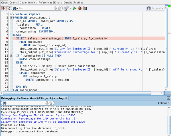 l_salaryとl_commissionの値がデータベース内の既存の値に変更されています。 「Debugging」タブをクリックします。