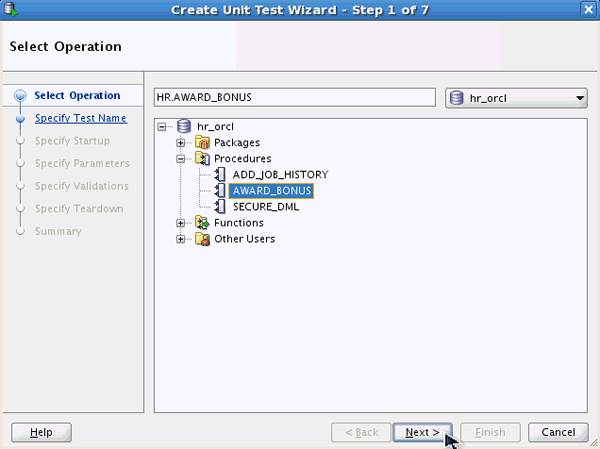 Select Operationウィンドウで、AWARD_BONUSプロシージャの作成に使用した「hr_orcl」接続を選択します。