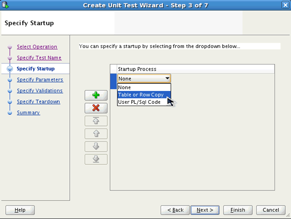 Specify Startupウィンドウで「+」アイコンをクリックし、ドロップダウン・リスト・ボックスから「Table or Row Copy」を選択します。