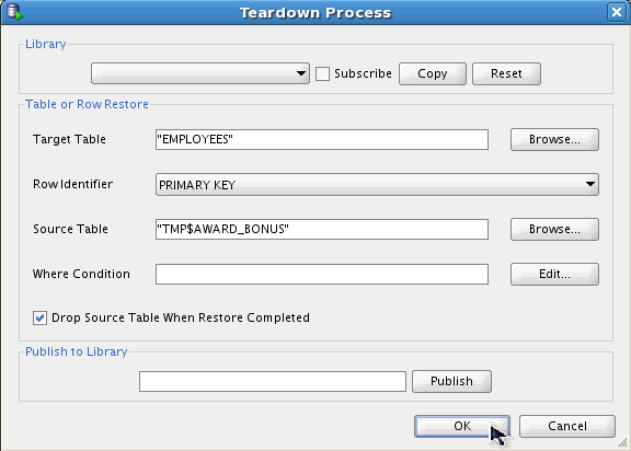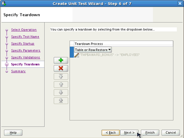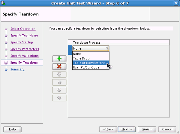 Specify Teardownウィンドウで「+」アイコンをクリックし、ドロップダウン・リスト・ボックスから「Table or Row Restore」を選択します。