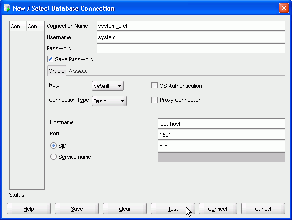 接続名フィールドにsystem_orcl(または接続を特定できるその他の名前)を入力し、ユーザー名フィールドにsystemを、パスワード・フィールドに<パスワード>を入力します。 「Save Password」チェック・ボックスを選択します。 ホスト名フィールドに<ホスト名>を入力し、SIDフィールドにorclと入力します。 「Test」をクリックします。