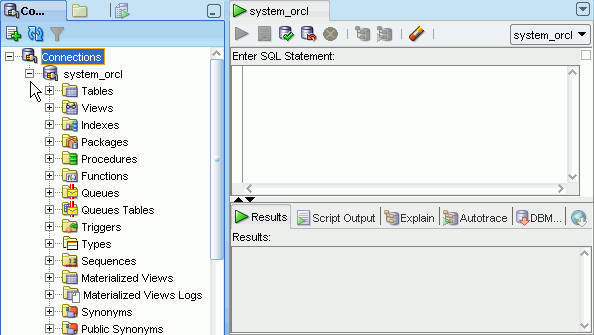 「system_orcl」接続を展開します。 注: 接続を開くと、自動的にSQL Worksheetが開きます。 SQL Worksheetを使用すると、先ほど作成した接続に対してSQLを実行できます。