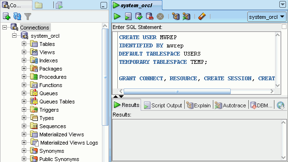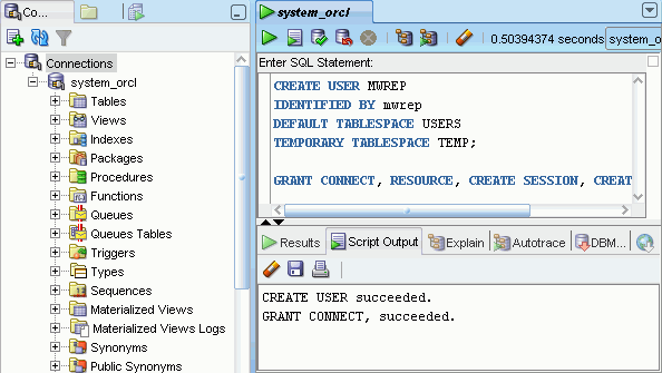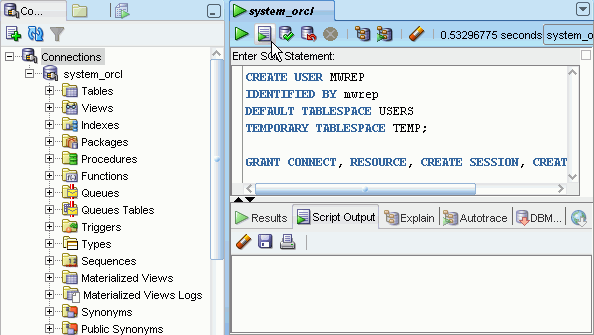 SQL Worksheetに次のコードを入力し、移行リポジトリ用のユーザーを作成します。 CREATE USER MWREP