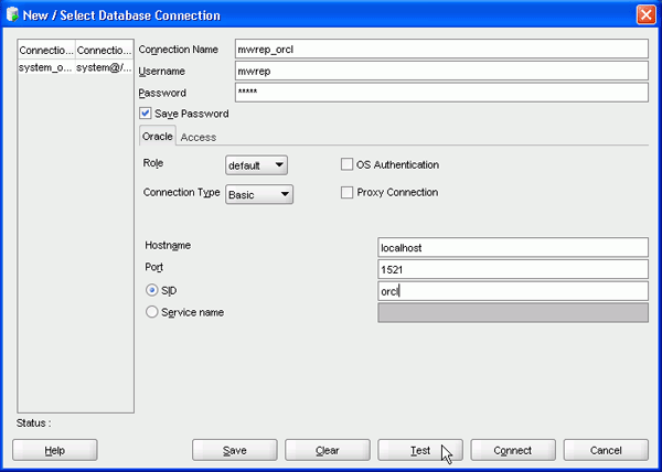 接続名フィールドにmwrep_orcl(または接続を特定できるその他の名前)を入力し、ユーザー名フィールドとパスワード・フィールドにmwrepと入力します。 「Save Password」チェック・ボックスを選択します。 ホスト名フィールドに<ホスト名>を入力し、SIDフィールドにorclと入力します。 「Test」をクリックします。