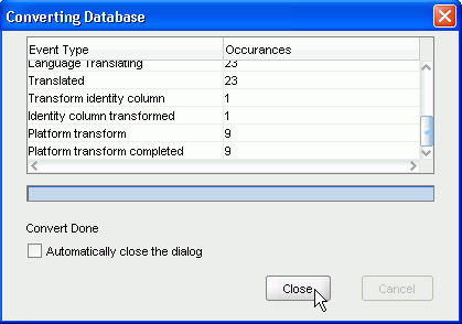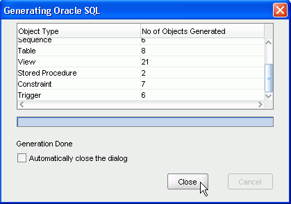Oracle SQLが生成されます。 処理が完了したら、「Close」をクリックします。