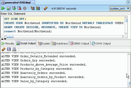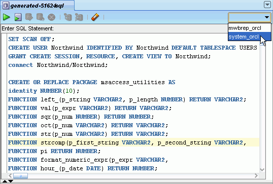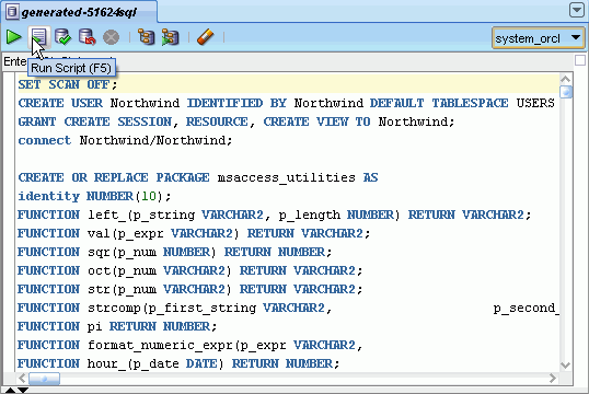 スクリプトのSQLが表示されます。 右側のドロップダウン・リストから「system_orcl」を選択します。