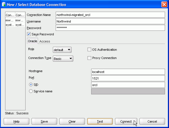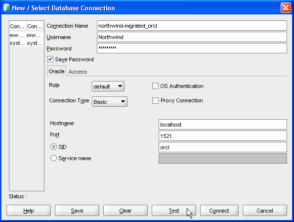 接続名フィールドにnorthwind-migrated_orcl(または接続を特定できるその他の名前)を入力し、ユーザー名フィールドとパスワード・フィールドにNorthwindと入力します。 パスワード・フィールドには、大文字と小文字を区別して入力します。 「Save Password」チェック・ボックスを選択します。 ホスト名フィールドに<ホスト名>を入力し、SIDフィールドにorclと入力します。 「Test」をクリックします。