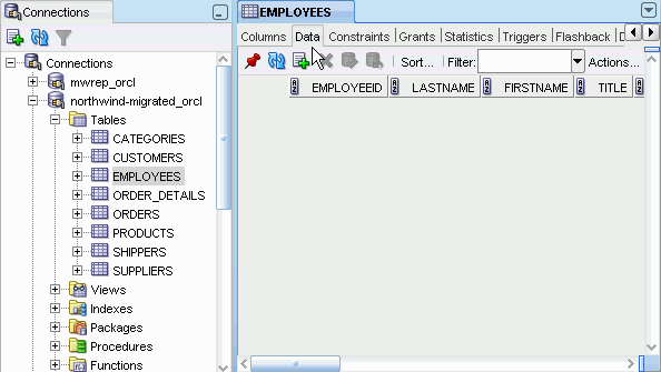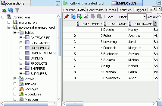 Oracleに変換されたデータベース表が表示されます。 「EMPLOYEES」表を選択します。
