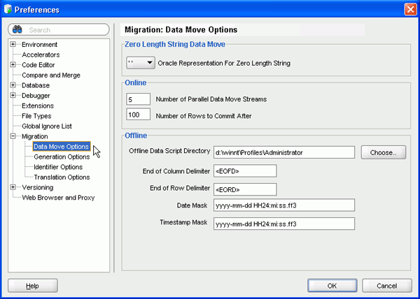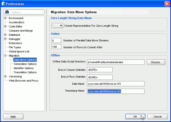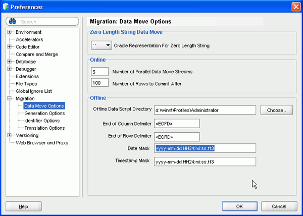 オフライン・データ移動スクリプトと、特にOracle SQL*Loaderの制御ファイルから正しい形式が参照されるように、プリファレンスに日付書式マスクを指定します。 次の手順を実行します。