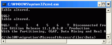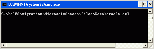 DOSコマンド・プロンプトを開いて、次のコマンドを実行します。 <prompt> cd <location where files are> <prompt> oracle_ctl 前提条件の項で提供されたファイルを解凍したDataディレクトリに、ファイルが保管されています。 oracle_ctlは、データのロード文が含まれたbatファイルです。 ここでは、sqlldrを使用してデータがロードされます。