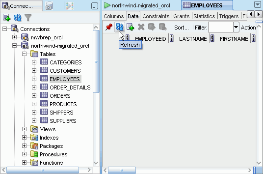 Oracle SQL Developerに切り替え、「Refresh」アイコンをクリックして接続を更新します。