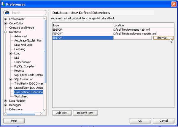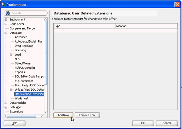「Database」ノードを展開し、「User Defined Extensions」を選択します。 「Add Row」をクリックします。