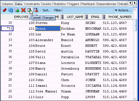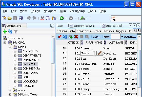 「HR_ORCL」接続を展開し、「Tables」ノードを展開します。 「EMPLOYEES」を選択します。 「Data」タブを選択します。