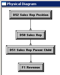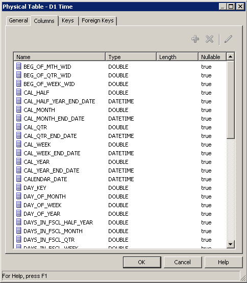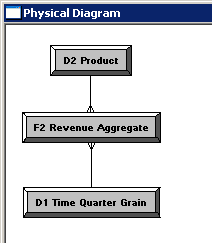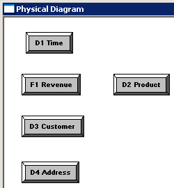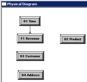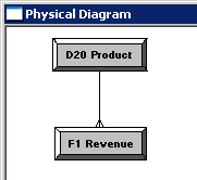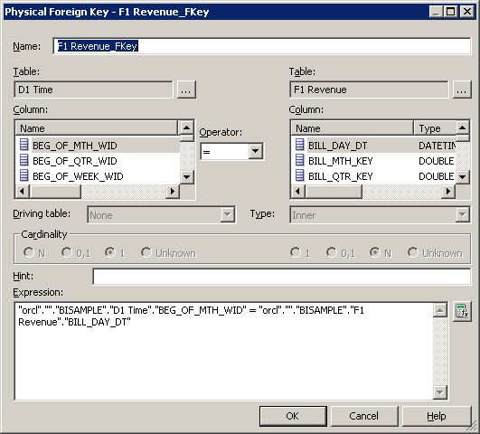 「D1 Time」表をクリックし、続いて「F1 Revenue」表をクリックします。 Physical Foreign Keyダイアログ・ボックスが開きます。 どの表を最初にクリックするかは重要です。 結合は、最初に選択した表のキー列を次に選択した別のキー列と結合する、1対多(1:N)の関係を構築します。
