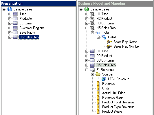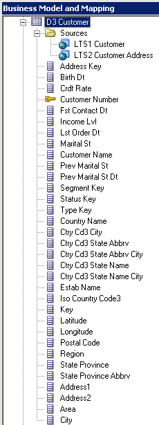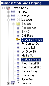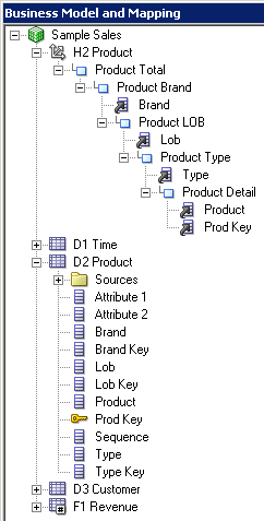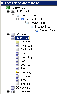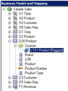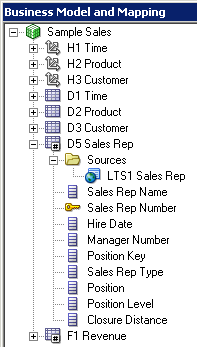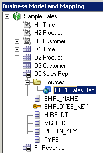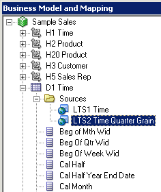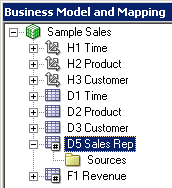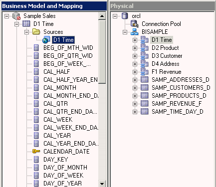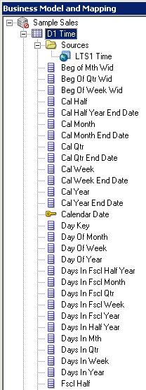 D1 Time論理表の「Sources」フォルダを展開します。 D1 Timeという論理表ソースがあることを確認してください。 この論理表ソースはPhysicalレイヤーのD1 Timeエイリアス表にマッピングされています。