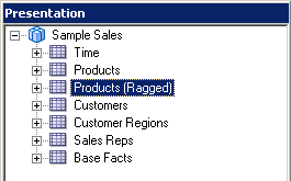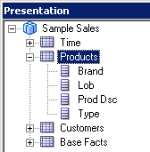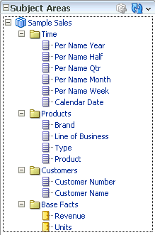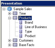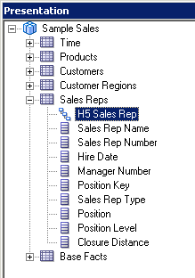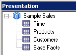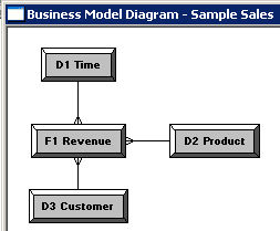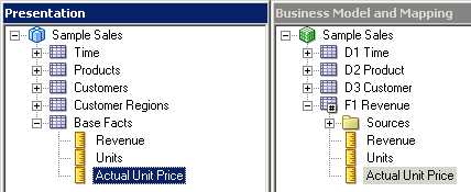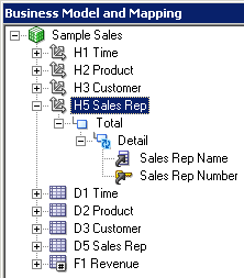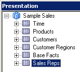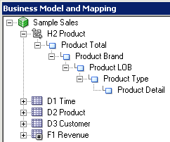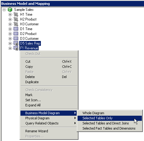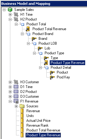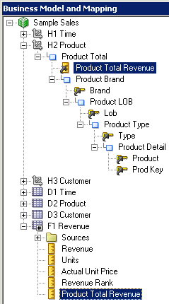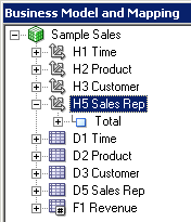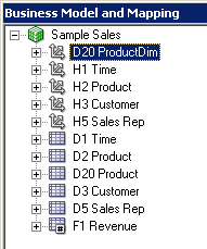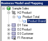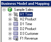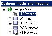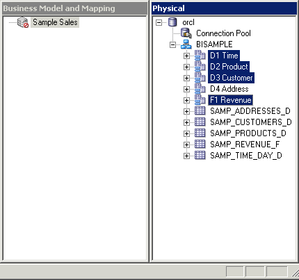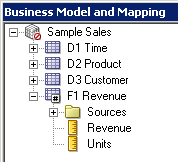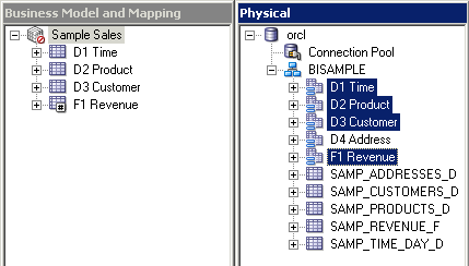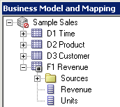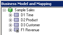 4つのエイリアス表をPhysicalレイヤーからBusiness Model and MappingレイヤーのSample Salesビジネス・モデルにドラッグします。 Sample Salesビジネス・モデルに表が追加されます。 3つのディメンション表には同じアイコンが付いていますが、F1 Revenue表には#記号を含むアイコンが付いており、ファクト表であることが示されています。
