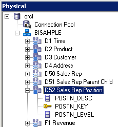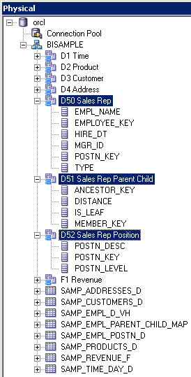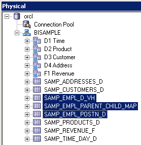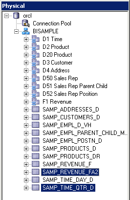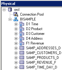 「orcl」→「BISAMPLE」の順に展開し、リポジトリのPhysicalレイヤーに5つの表がインポートされていることを確認します。