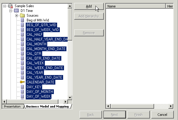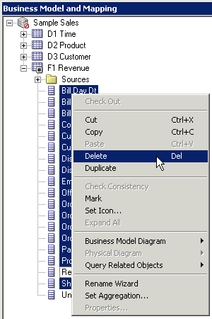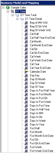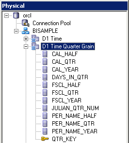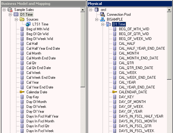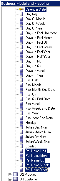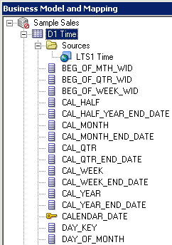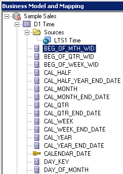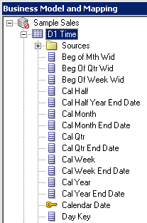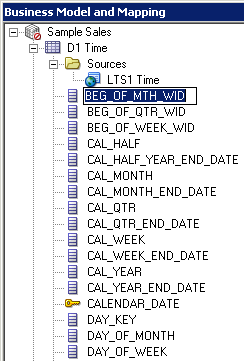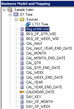 「D1 Time」論理表を展開します。 論理列は、エイリアス表をPhysicalレイヤーからBMMレイヤーにドラッグしたときに、表ごとに自動的に作成されました。