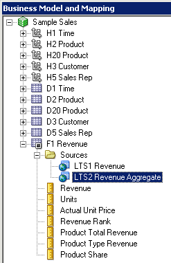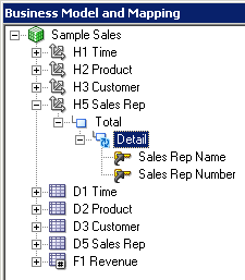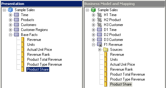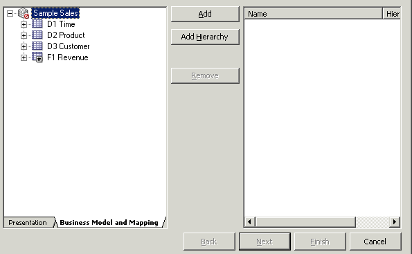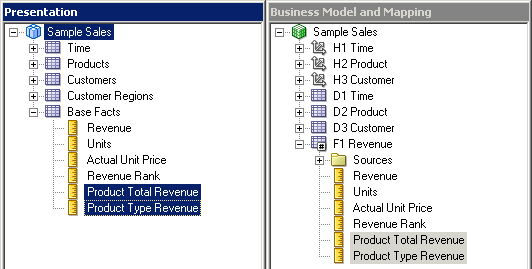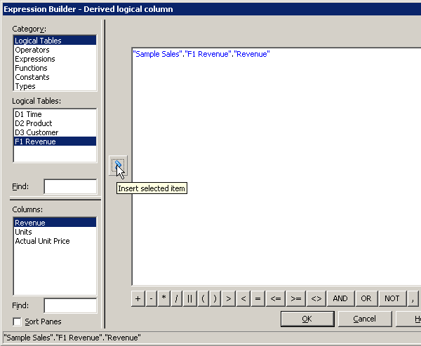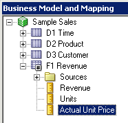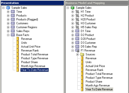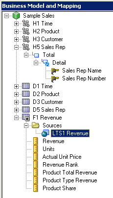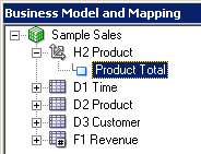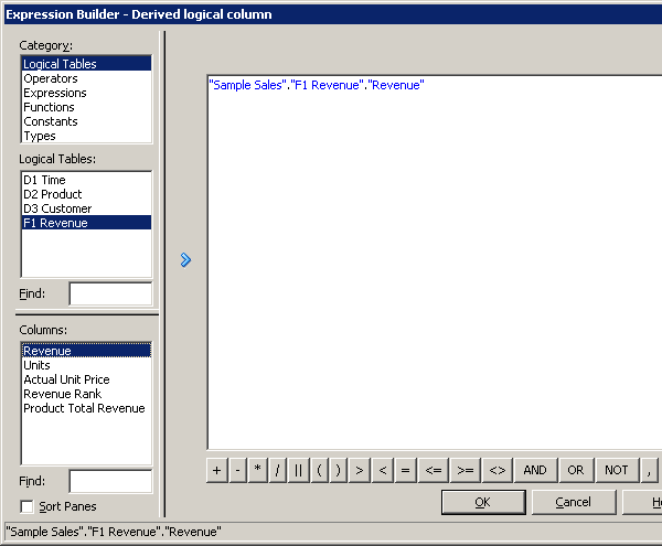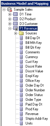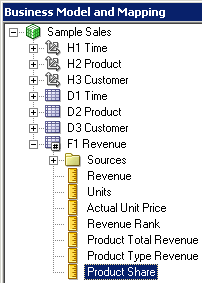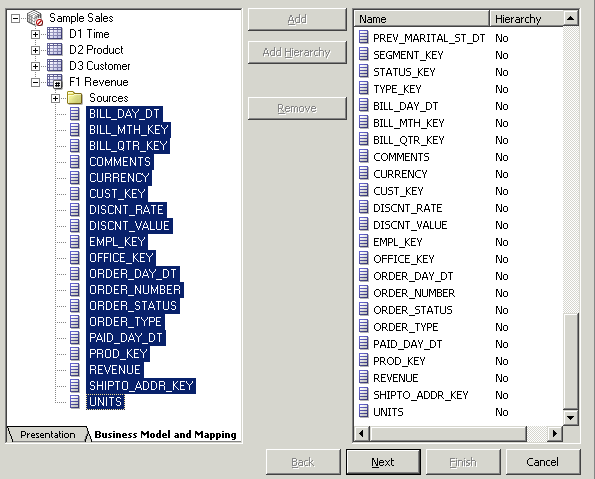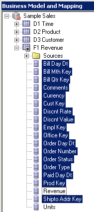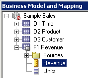残りの3つの論理表についてもこの手順を繰り返して、Sample Salesビジネス・モデルのすべての論理列を右ペインに追加します。 スクリーンショットにはF1 Revenueの列だけが表示されています。