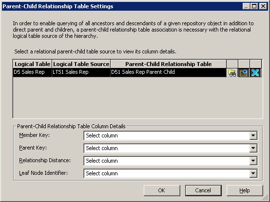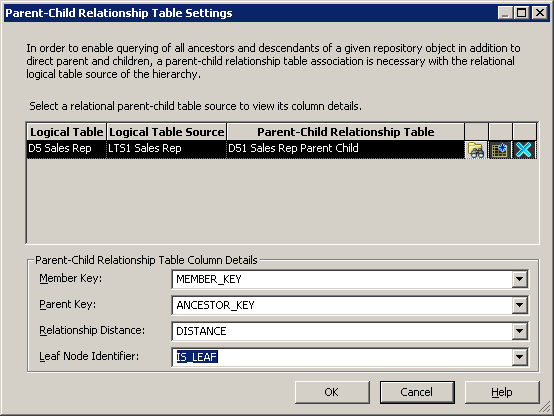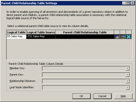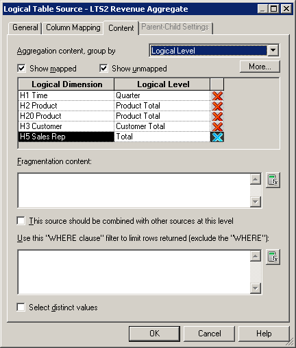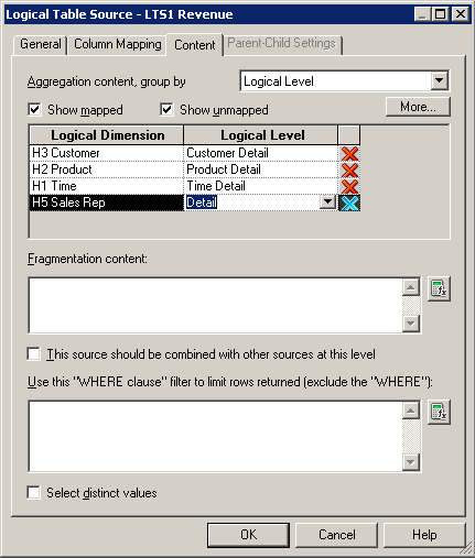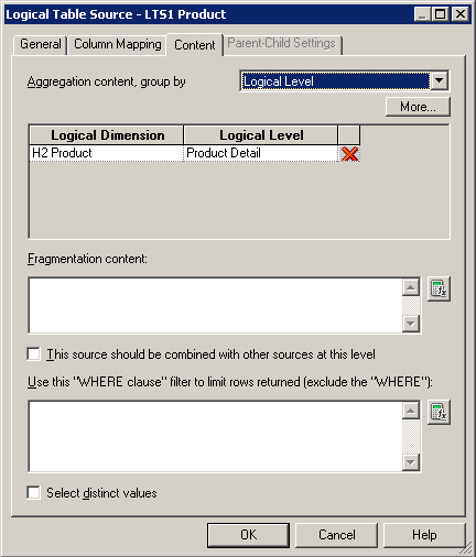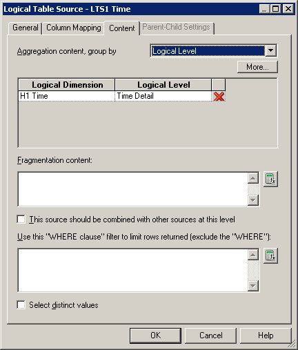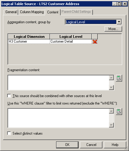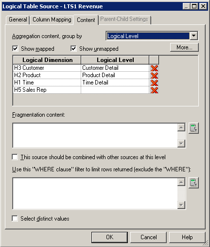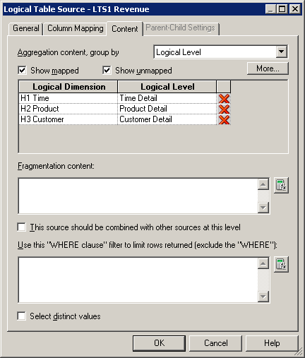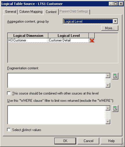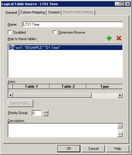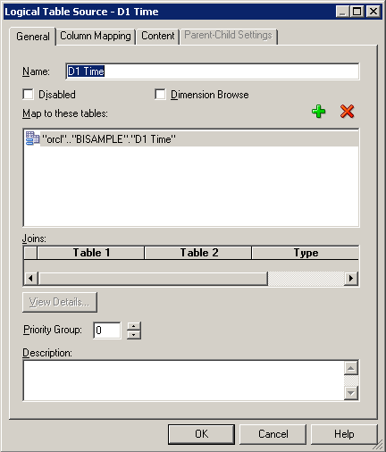 ContentタブとParent-Child Settingsタブについては、後で論理ディメンション階層を構築するときに詳しく説明します。 「OK」をクリックして、Logical Table Sourceダイアログ・ボックスを閉じます。 必要に応じて、残りの論理表の論理表ソースも確認してください。